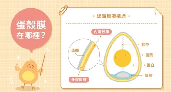 專利蛋殼膜: 包裹在雞蛋蛋殼內側、連接蛋殼與蛋白之間的一層半透明薄膜,雖然很薄(約0.07 毫米),但富含多種珍貴成分,如膠原蛋白、彈力蛋白、玻尿酸、葡萄糖胺和軟骨素等,近年來被廣泛應用於保養品和保健食品,有助於美容護膚和關節保健。