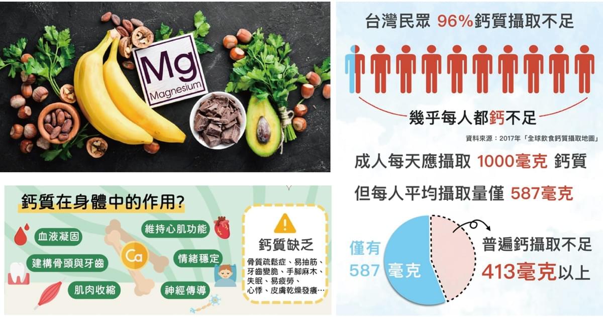 在台灣,高達 96% 的民眾鈣質攝取不足。成年人每天應攝取 1000 毫克鈣質,但平均攝取量僅587 毫克,缺口高達413 毫克以上。當身體缺鈣時,可能出現骨質疏鬆、易抽筋、失眠、易疲勞等症狀。