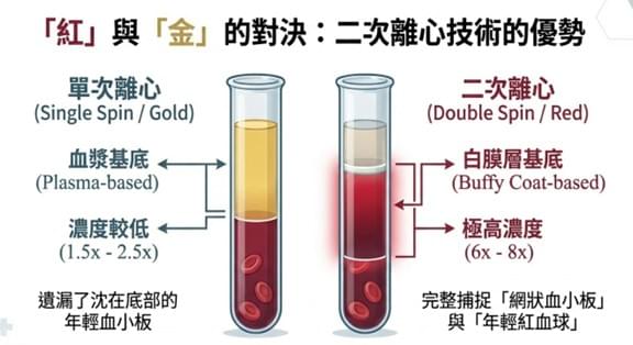 能萃取到比一次離心高出數倍的血小板濃度,國際研究顯示濃度可超過1815×10⁹/L。